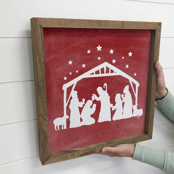 This beautiful nativity silhouette on a chalked red background and aged oak frame. This wood sign can stand up on a shelf or table display.